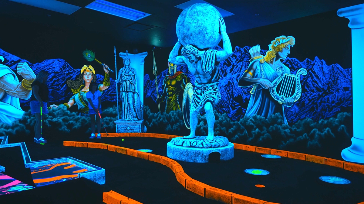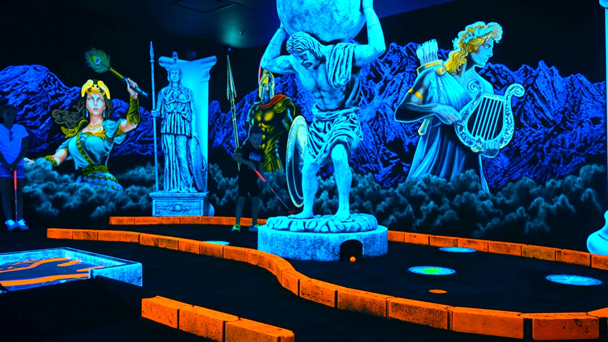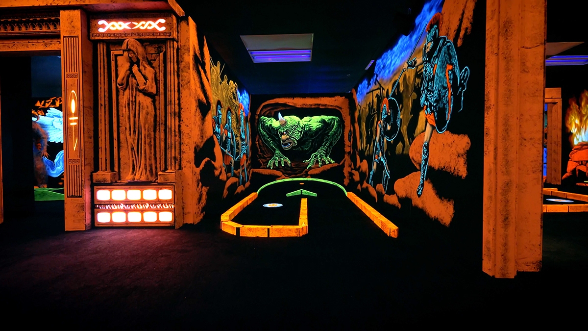 Prepare to battle villains inside Superhero City an immersive comic book blacklight mini golf experience.