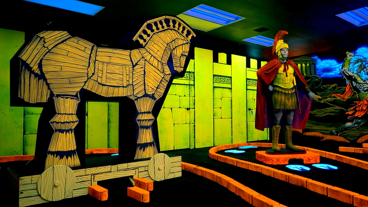 As family fun centers have moved indoors so has mini golf and the best way to create a new mini golf while maximizing space is with BLACKLIGHT theming. We create indoor blacklight themed mini golf attractions custom for customers round the World. We’ll take between 2,000 and 6,000 square feet and create a magical World utilizing CGI FX, Props, Artwork, Built Out Sets and even multi motion animations. Mini golf is the single best attraction for any indoor amusement center because it appeals to all guests of all ages. What separates our company from everyone else is we create COMPLETE themed attractions which include interior walls, built out sets, sound in every room, complete with all the golf equipment, façade, counters, with turnkey installation.
