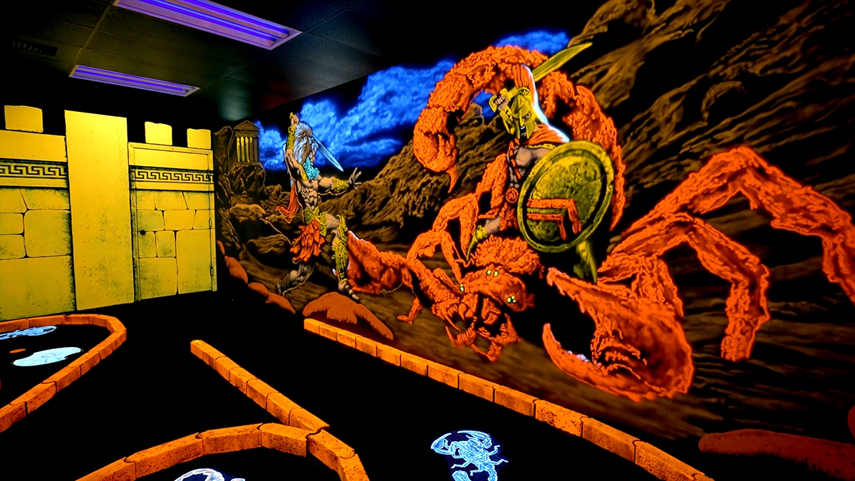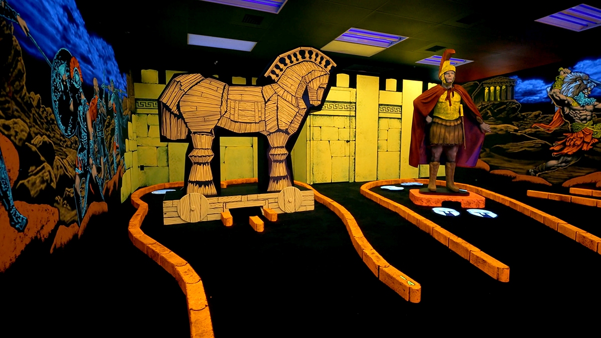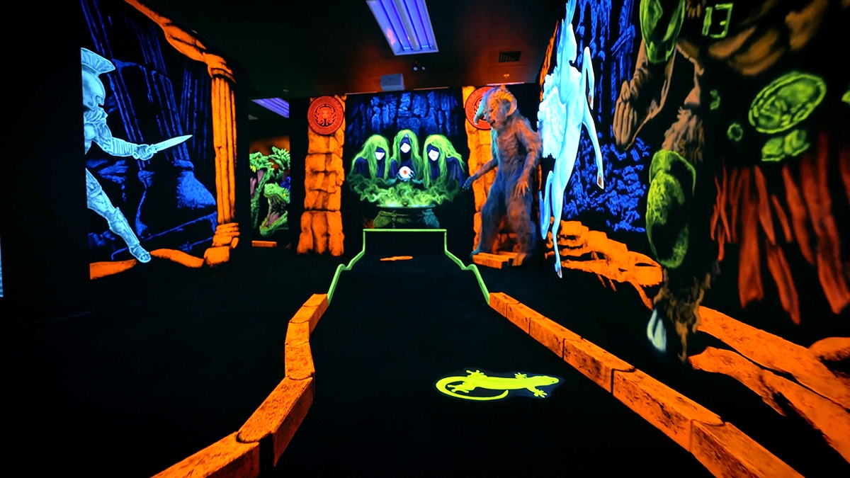 As family fun centers have moved indoors so has mini golf and the best way to create a new mini golf while maximizing space is with BLACKLIGHT theming. We create indoor blacklight themed mini golf attractions custom for customers round the World. We’ll take between 2,000 and 6,000 square feet and create a magical World utilizing CGI FX, Props, Artwork, Built Out Sets and even multi motion animations. Mini golf is the single best attraction for any indoor amusement center because it appeals to all guests of all ages. What separates our company from everyone else is we create COMPLETE themed attractions which include interior walls, built out sets, sound in every room, complete with all the golf equipment, façade, counters, with turnkey installation.